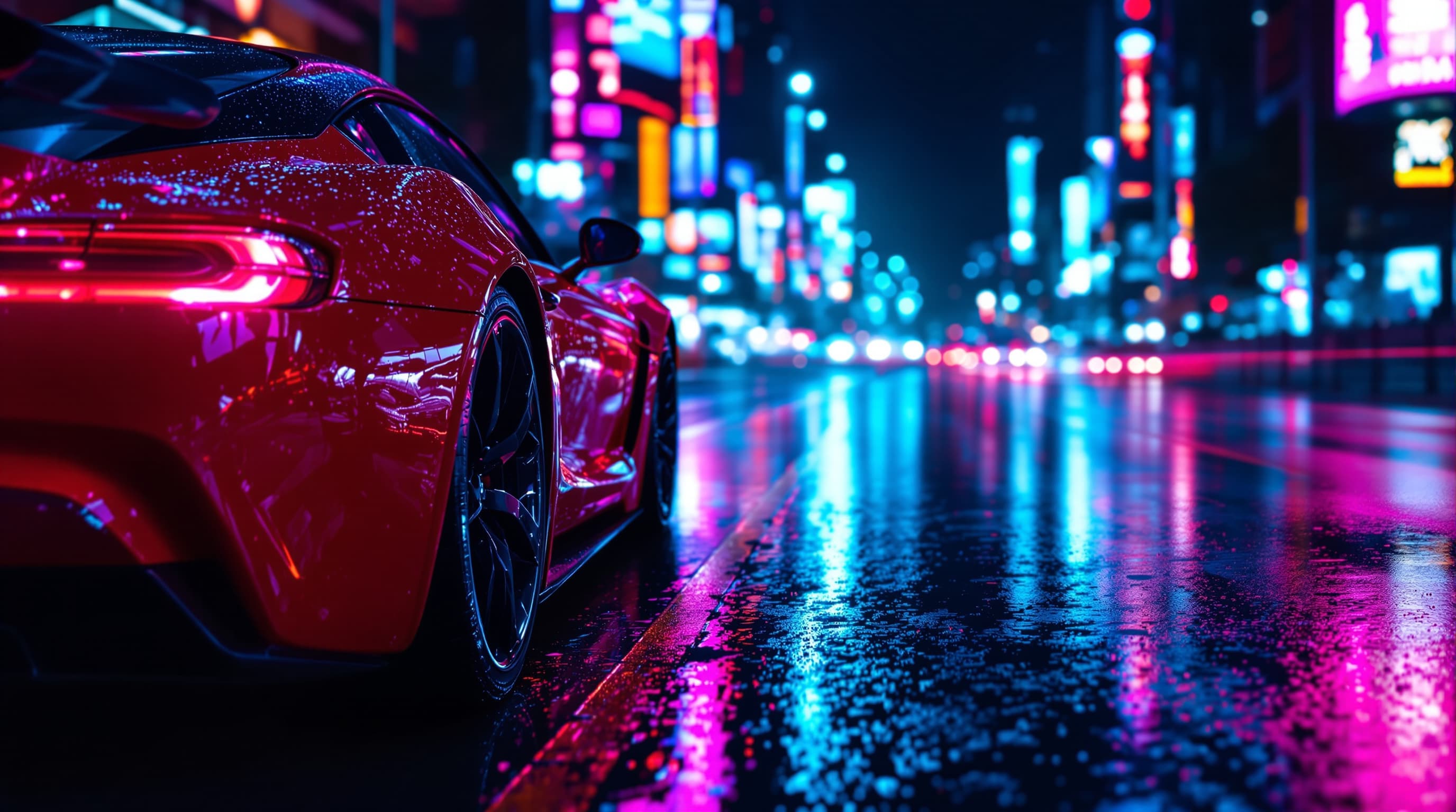 Futuristic 3D sports car, modern, rear view, low angle. Realistic photo. Night, neon city, lights, wet asphalt. Still from a movie.